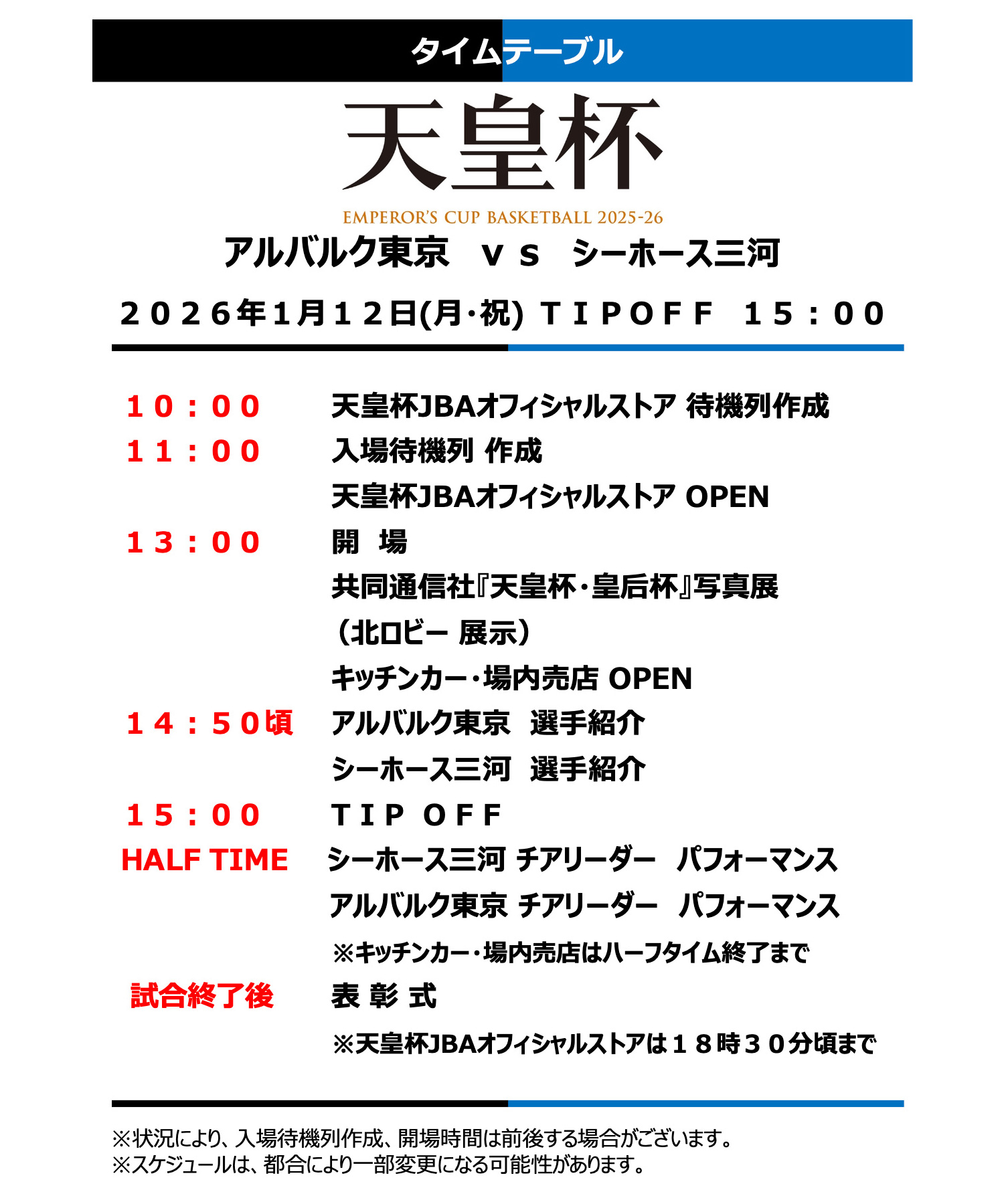 「第101回天皇杯 全日本バスケットボール選手権大会 ファイナルラウンド」最終日、ファイナルのタイムテーブルは以下のとおりです。
